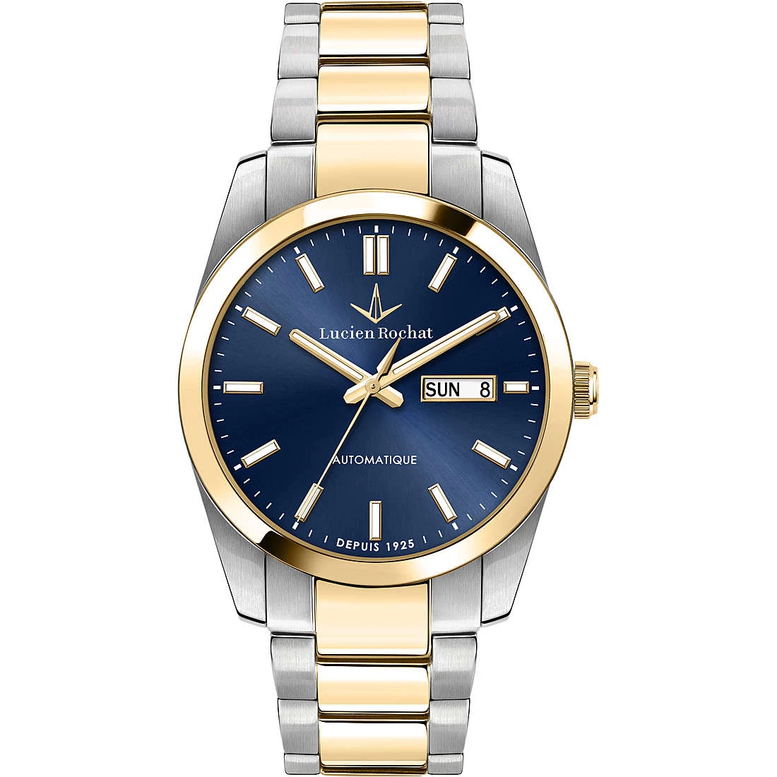 Orologio Automatico Da Uomo Di Lucien Rochat. Orologio Realizzato In Acciaio, Pvd Oro. La Cassa È Lucida E Satinata Da 41Mm. Il Quadrante È Di Colore Con Effetto Sunray Blu. Il Vetro Zaffiro. Bracciale In Metallo Di Colore Argento E Oro Con Fibbia Con Pulsanti. La Resistenza All’Acqua È 5 Atm. La Referenza È R0423114002.