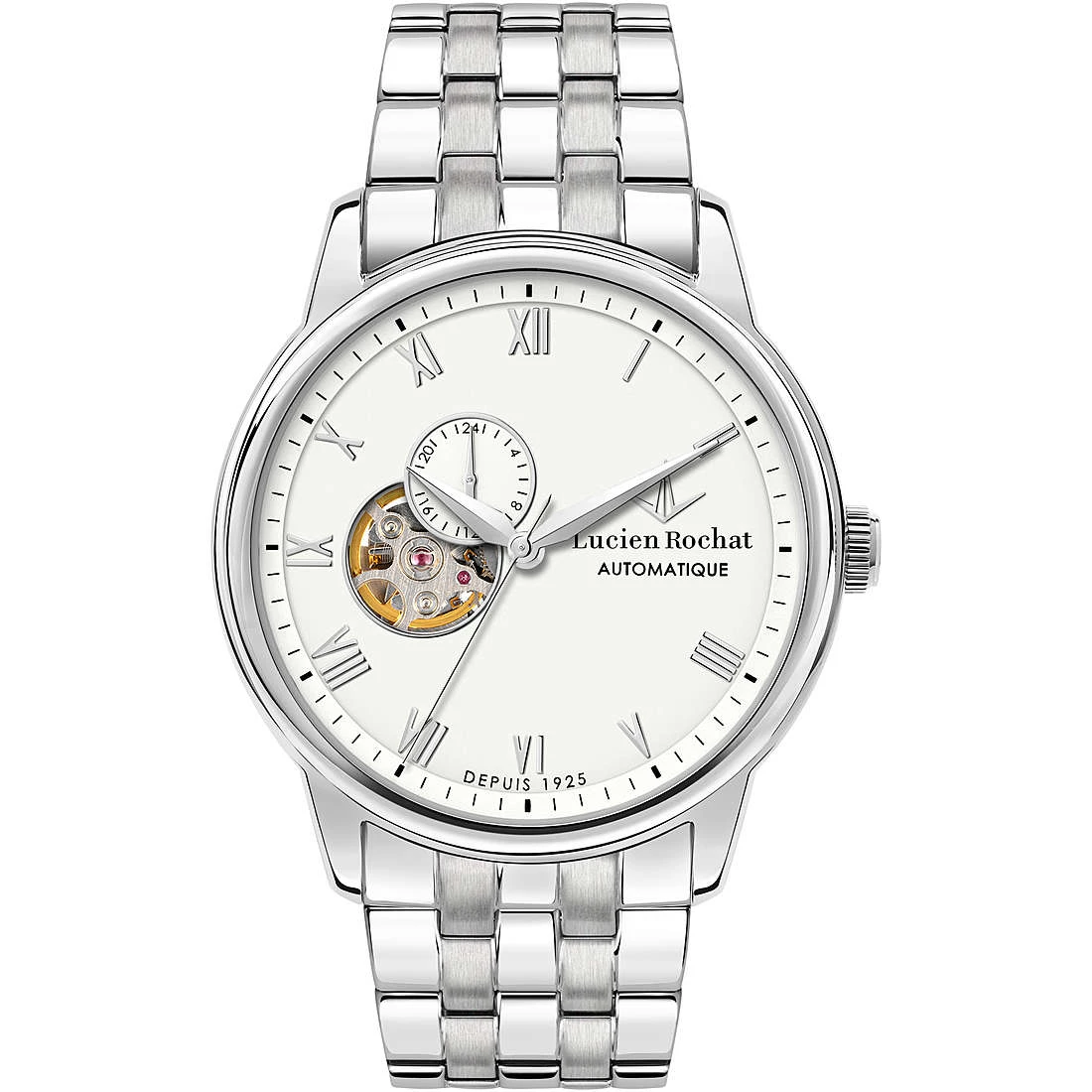 Orologio Automatico Da Uomo Di Lucien Rochat. Orologio Realizzato In Acciaio. La Cassa È Acciaio Lucida Da 42Mm. Il Quadrante È Di Colore Argento Bianco Brillante. Il Vetro Zaffiro. Bracciale In Metallo Di Colore Argento Con Fibbia A Farfalla. La Resistenza All’Acqua È 3 Atm. La Referenza È R0423116001.