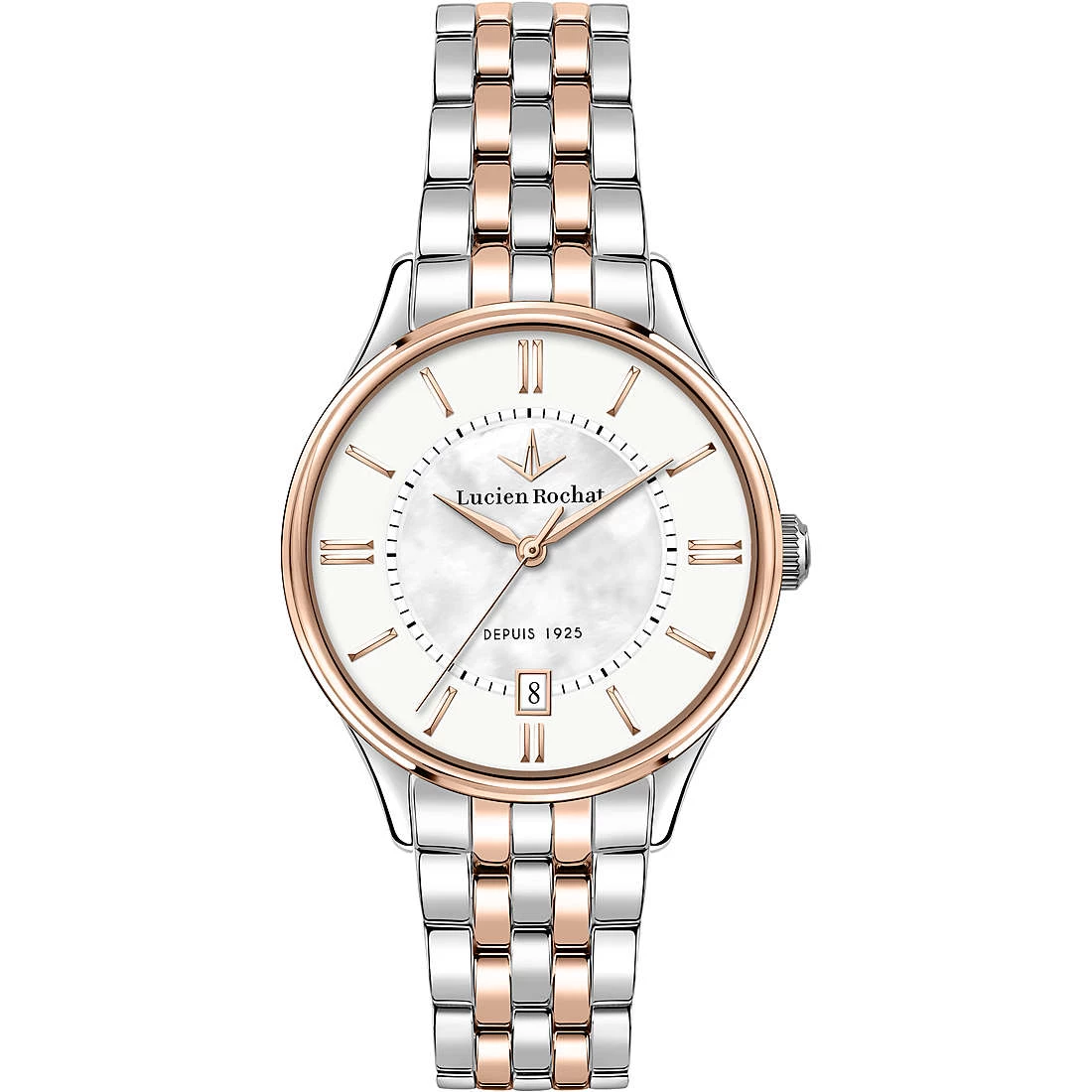 Orologio Solo Tempo Da Donna Di Lucien Rochat. Orologio Con Datario Realizzato In Acciaio, Pvd Oro Rosa. La Cassa È Acciaio Lucida Da 33 Mm. Il Quadrante È Di Colore Argento Bianco Brillante. Il Trattamento Minerale Zaffiro. Bracciale In Metallo Di Colore Acciaio, Oro Rosa Con Deployment. La Resistenza All’Acqua È 3 Atm. La Referenza È R0453115503.