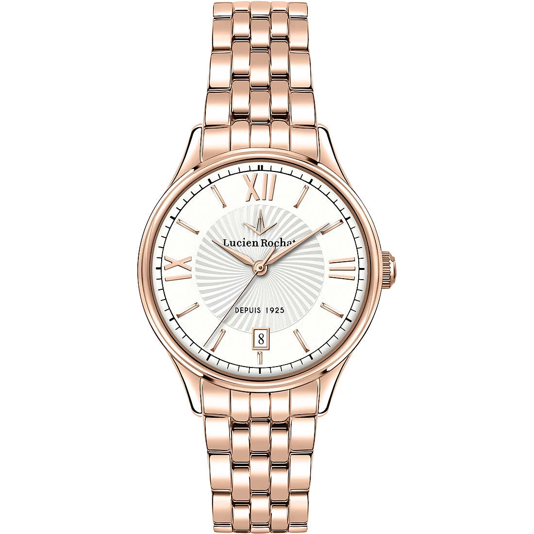 Orologio Solo Tempo Da Donna Di Lucien Rochat. Orologio Con Datario Realizzato In Acciaio, Pvd Oro Rosa. La Cassa È Acciaio Lucida Da 33 Mm. Il Quadrante È Di Colore Argento Bianco Brillante. Il Trattamento Minerale Zaffiro. Bracciale In Metallo Di Colore Oro Rosa Con Deployment. La Resistenza All’Acqua È 3 Atm. La Referenza È R0453115501.