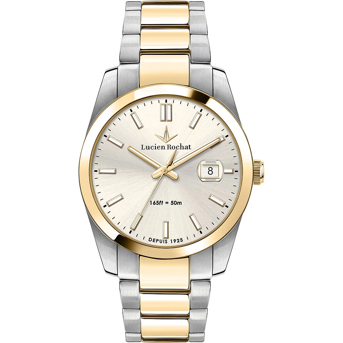 Orologio Solo Tempo Da Uomo Di Lucien Rochat. Orologio Con Datario Realizzato In Acciaio, Pvd Oro. La Cassa È Lucida E Satinata Da 41Mm. Il Quadrante È Di Colore Argento Bianco Brillante. Il Trattamento Vetro Zaffiro. Bracciale In Metallo Di Colore Argento E Oro Con Fibbia Con Pulsanti. La Resistenza All’Acqua È 5 Atm. La Referenza È R0453114001.