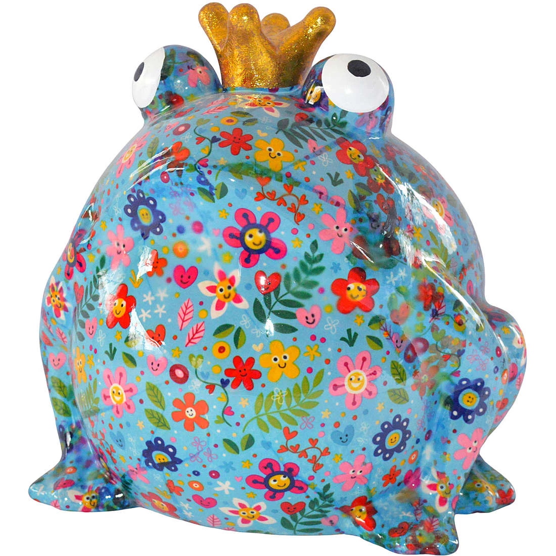 Salvadanaio Di Pomme Pidou. Oggetto Realizzato In Ceramica A Forma Di Rana. Variante: Happy-Flowers-Skyblue. Dimensioni: L 33 X D 33 X H 35 Cm. La Referenza E’ 148-00110E