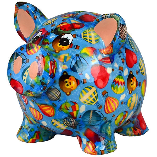 Salvadanaio Di Pomme Pidou. Oggetto Realizzato In Ceramica A Forma Di Maiale. Variante: Air-Balloons-Trueblue. Dimensioni: L 16.5 X D 13.5 X H 14.1 Cm. La Referenza E’ 148-00647C