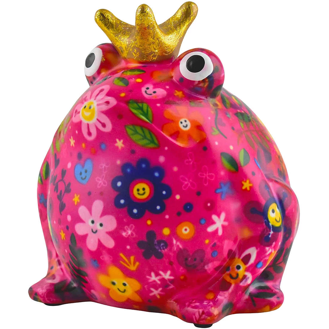 Salvadanaio Di Pomme Pidou. Oggetto Realizzato In Ceramica A Forma Di Rana. Variante: Happy-Flowers-Razzberry. Dimensioni: L 18 X D 16 X H 14 Cm. La Referenza E’ 148-00754C