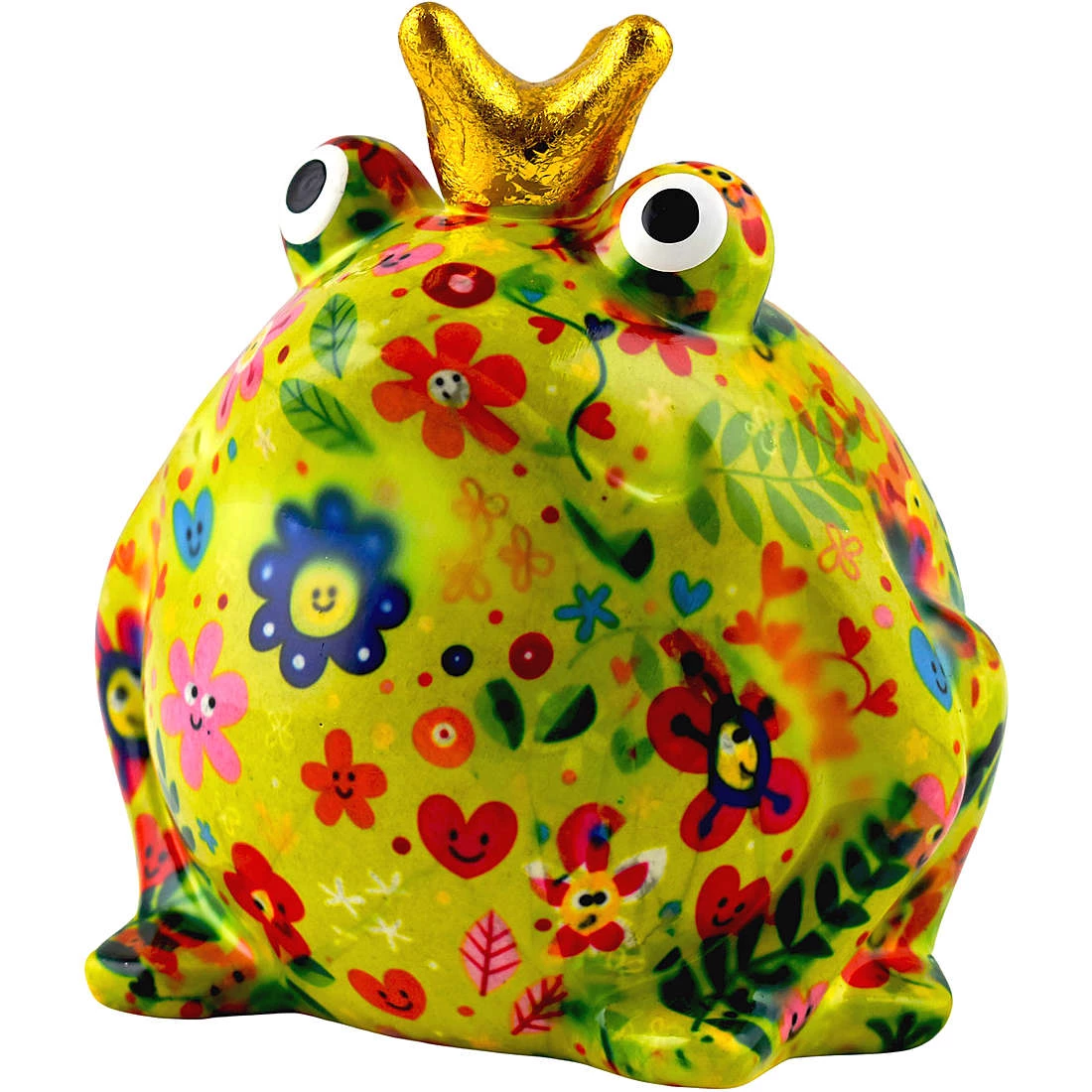 Salvadanaio Di Pomme Pidou. Oggetto Realizzato In Ceramica A Forma Di Rana. Variante: Happy-Flowers-Froggreen. Dimensioni: L 18 X D 16 X H 14 Cm. La Referenza E’ 148-00716F